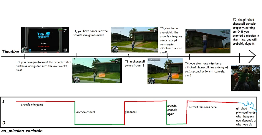 Ever since the 10 year remaster of San Andreas, there has been a glitch that allows you to gain control of CJ while inside an arcade minigame. This can be used to set up a glitched phonecall, like the ones seen in Josh's Vigilante om0, which can then be used to dupe.